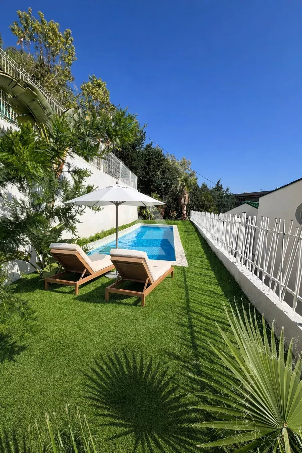 La villa dispose d’un jardin privatif de 392 m² agrémenté d’une piscine avec pompe à chaleur, idéal pour profiter du climat méditerranéen.