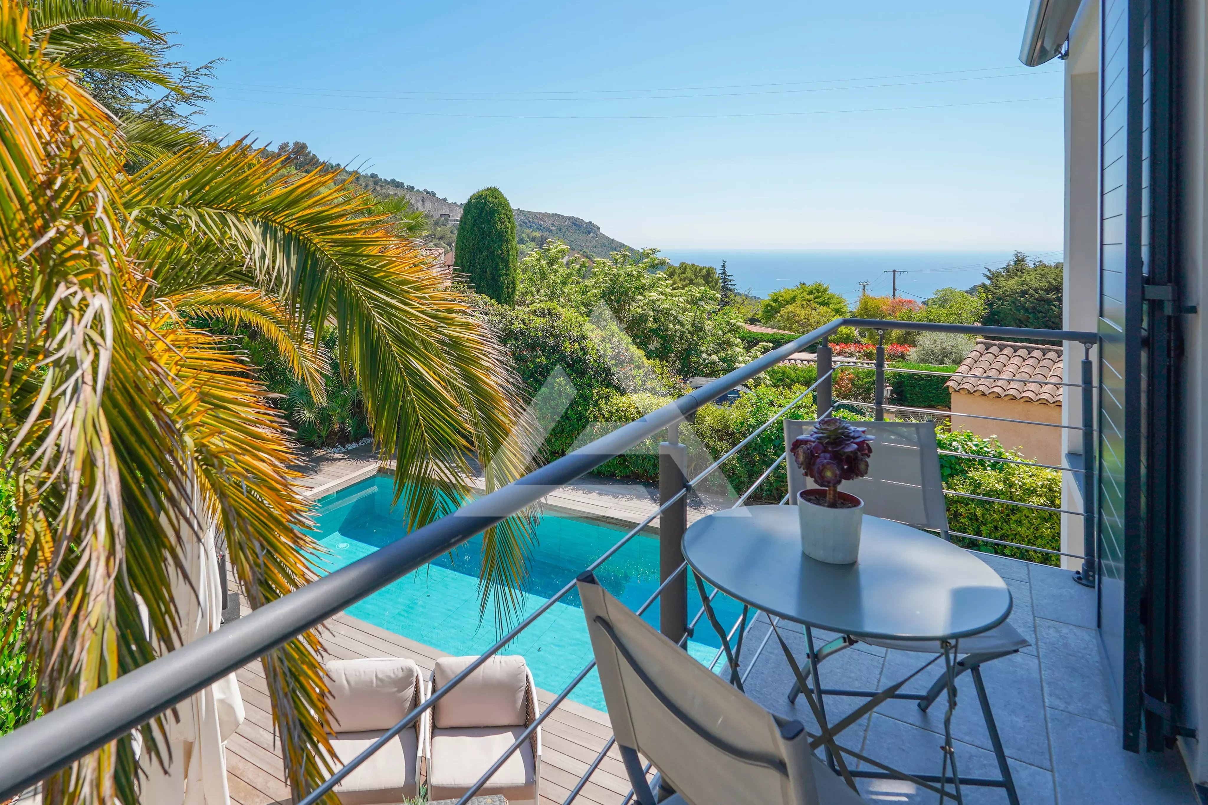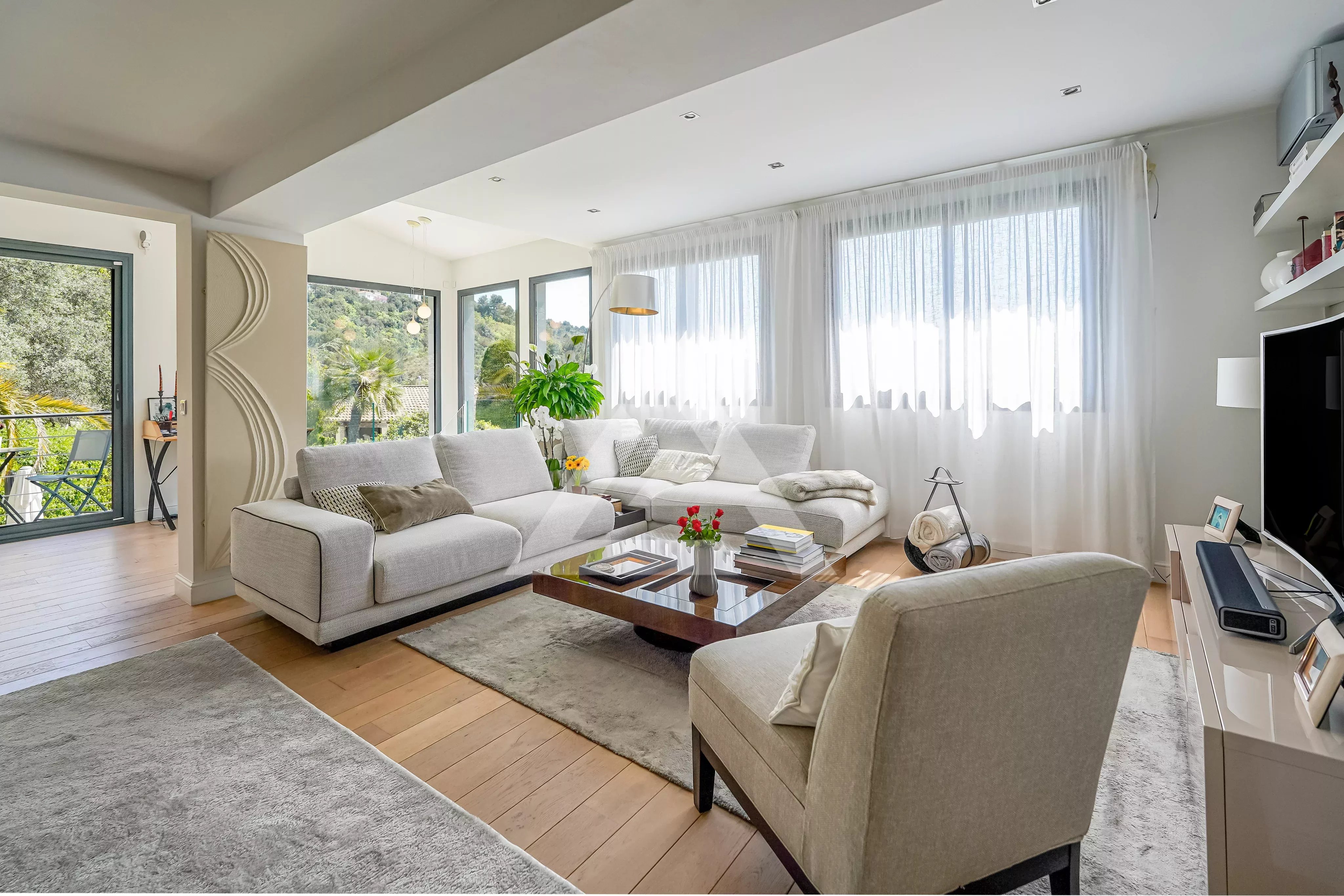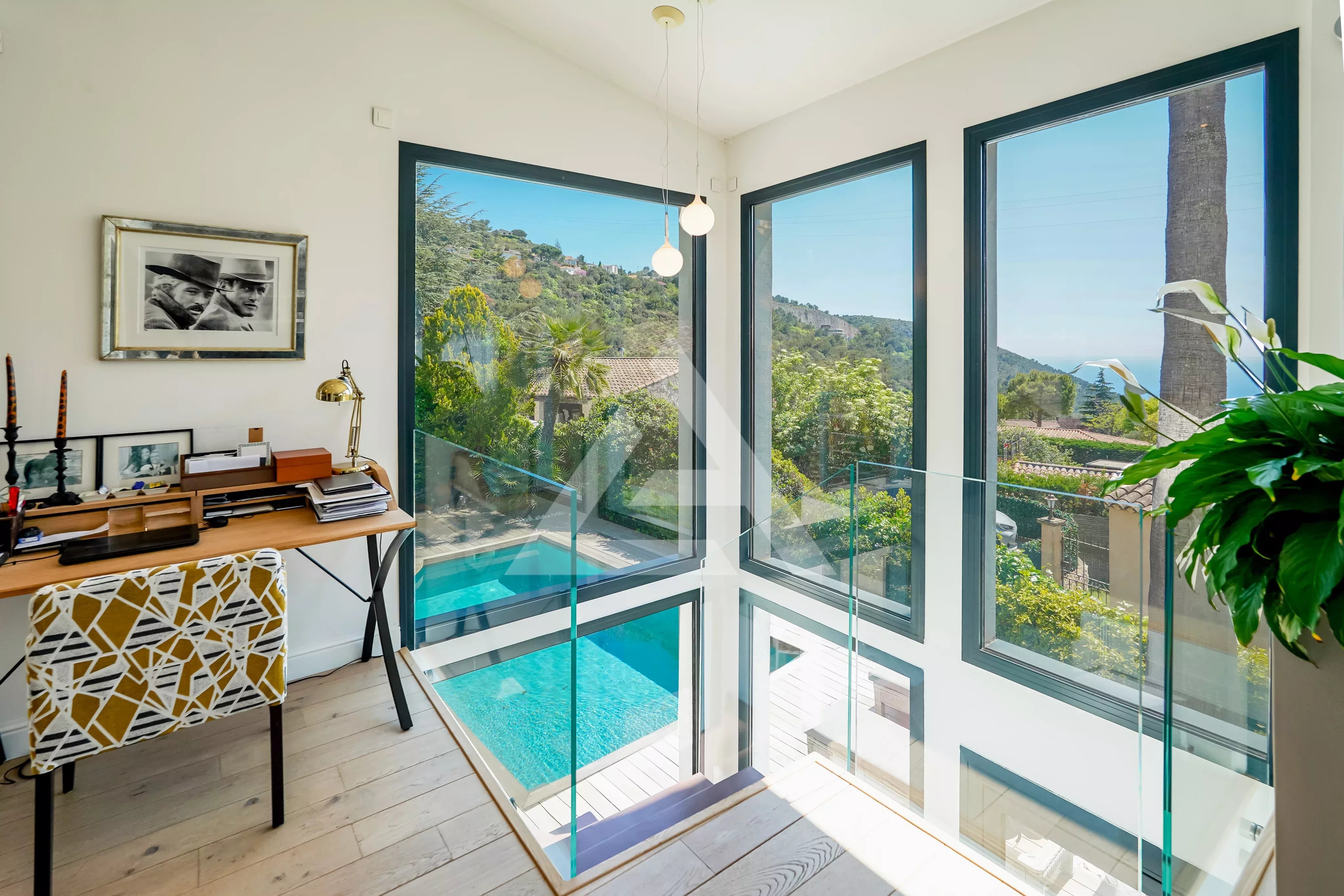 Située sur la commune de La Turbie dans un secteur calme et à 10 minutes à pieds du centre ville, cette villa élevée sur trois niveaux de 206 m² habitables bénéficie d'une vue mer.