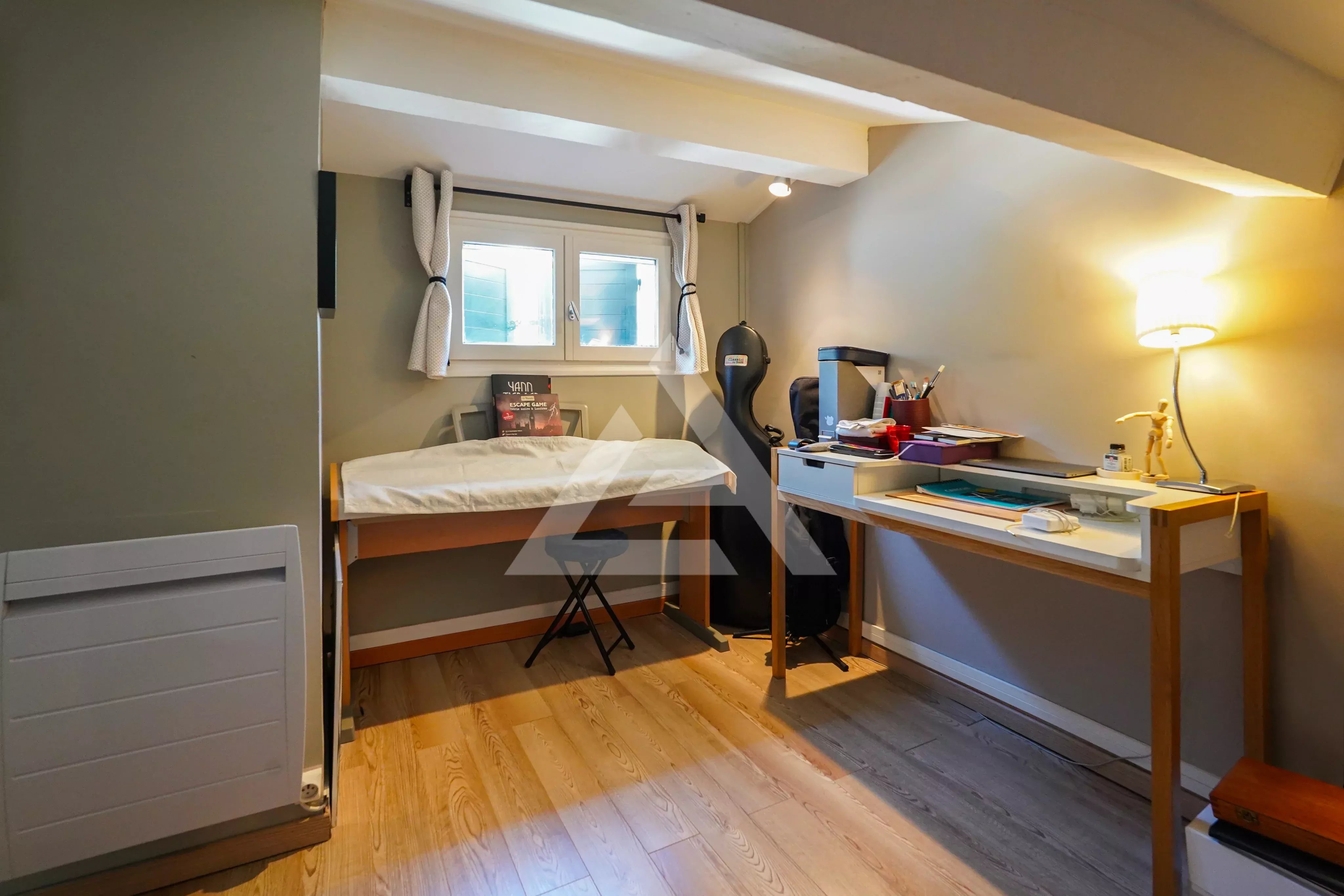 - À l'étage : deux chambres, un espace bureau ou petite chambre, une salle de douche avec toilette.